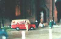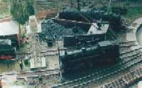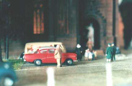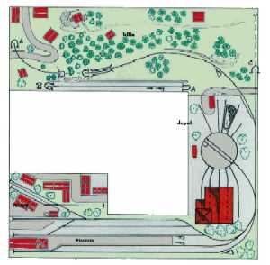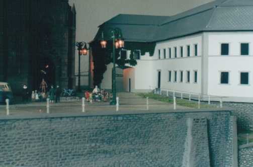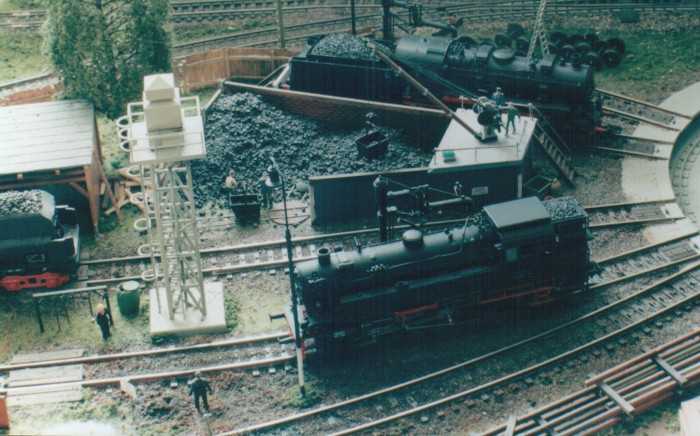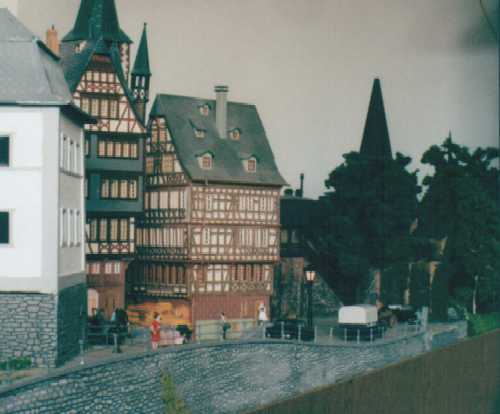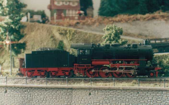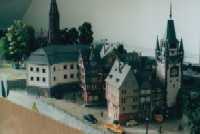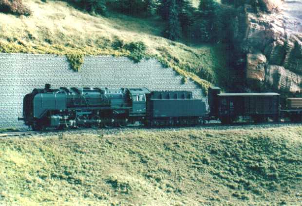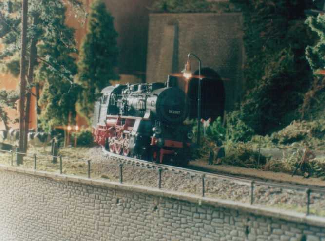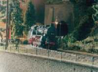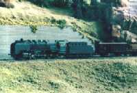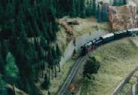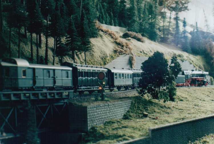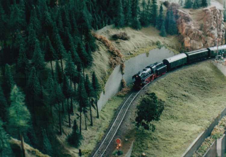 The layout is in a room, which is approx. 3x3 m. It has been built during the last years, the main station is left from my former layout and recycled. The whole layout consists of parts, which are max 0.8x1.2 m each. As I am a fan of Wurttembergian railways the layout is settled there. So, I am allowed to use typical Wurttembergian vehicles, such as the famous class C (DRG: class 18.1), the star of Wurttembergian railways and in my opinion the most beautiful loco ever built. Other Wurttembergian vehicles are class T5 (DRG: class 75.0) and Wurttembergian T3 (DRG: class 89.3). There are also some Wurttembergian coaches in service on my layout. The time is about 1956-1959, because this assumption allows to use both, older vehicles of the former state railways (such as mentioned above) and some newer, which were built by the Deutsche Bundesbahn (e.g. V 200.0, Schienenbus, steam locos class 23 and 82). The layout shows a single track main line in a mountainous and wooded landscape. If you leave the fiddle yard "by train", that is tunnel B on the layout-map, you first pass a long wall on the left side. The steep gradient means heavy duty for steam locos and they often need support by a second loco when hauling long freight trains. After passing a signal the trains enter tunnel A, where they get the possibility to cross another train, which is on the way to the fiddle yard. Leaving tunnel A the tracks cross a road and then reach a small station "Neidhoehle", only consisting of a platform. Longer trains are not able to stop here, but nevertheless the station is well frequented, because from there you can reach a small castle, on the top of a hill. So, lots of excursionists stop here, especially on weekends. After leaving that station and another short tunnel there is a long turn right and passing the depot on your right hand you reach the station of "Nibelheim". Nibelheim is a terminus station and all trains have to change their loco. So there is a small depot with turntable (Roco), where the locos can get coal and water and the drivers are able to spend the night if they don't have to immediately carry a train back. The engine shed gives place for three long locos (or even two tender locos each) and one small loco (that's class 89.3). There is additional place for some locos outside the shed. Some locos for local traffic are stationed here: class 52, 82, 93.5 and a Wurttembergian T3 for shunting. There is an additional branch line starting in Nibelheim, the tracks leave the main line near the depot and disappear in tunnel C. But the traffic is only held up by a Schienenbus. The city of Nibelheim itself shows lots of old buildings. The most important is the monastery, the large white/grey building on the pictures. The monastery's church burnt down in the last century and was replaced by a neo-Gothic one. The following trains are actually in use: Heavy freight trains (Durchgangsgueterzuege): class 44, 52 Local freight trains (Nahgueterzuege): class 56.25, 82, 93.5 F-trains (express, F-Zuege): class V 200.0, 23, 03, only if rerouted Stopping trains (Eilzuege): class 03, 18.1, 23, 38, 39 Local trains (Personenzuege): class 18.1,23, 38, 82, 93.5, compartment coaches, thunderboxes etc. Push-pull-trains (Wendezuege): class 78, 65, thunderboxes I use Maerklin's Digital Command Control by Motorola. Locos of the following manufacturers are in use: Maerklin, Fleischmann, Roco, Piko, Brawa. All tracks are Maerklin's K-track in track ballast "Porphyr" (ASAIR by Noch). Signals are by Maerklin (older) ans Viessmann (actually, very excellent stuff and not too expensive). Well, the layout is quite complete, but are some smaller parts which still have to be finished: the station of Nibelheim (partially) and some buildings are not complete yet. And, of course, I still have to do some detailing, e.g. painting the rails. When I have done this, I would be interested in building vehicles from kits. And don't forget to build a show-case. So there is enough work for the next time. P.S. Maybe you noticed, that the station names are taken from Richard Wagner's operas. Please give me your opinion or impression or question by e-mail to (froemmel@gif.uni-hannover.de) |